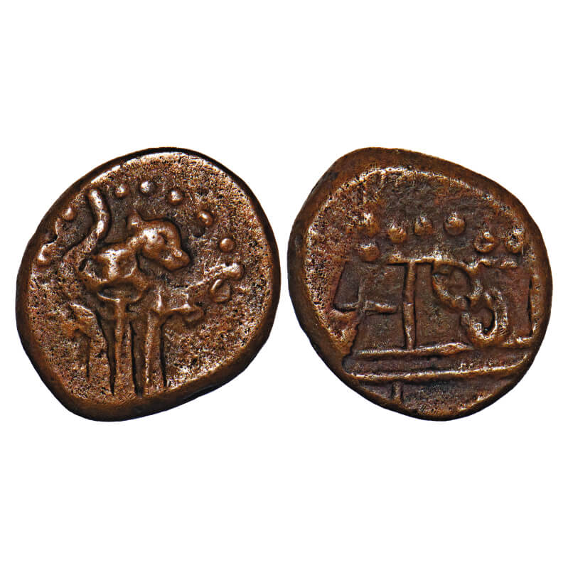 | Post Vijayanagar, Local Polygars, (17-18c AD), Copper Kasu, 2.73g, 12.90x13.50 mm, Obv: Monkey with tail raised, Dotted border around, Trishul below monkey presumably part of under-type coin, Rev: Corrupt Nagari legend in two lines. Very Fine, Very Scarce. |