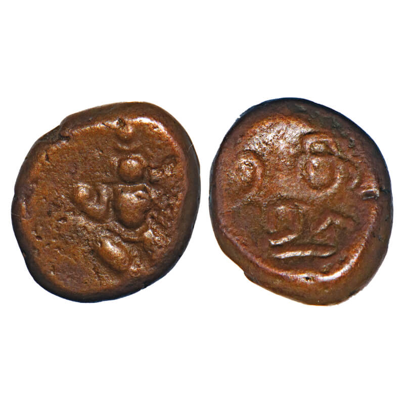 | Post Vijayanagar, Local Polygars, (17-18c AD), Copper Kasu, 2.61g, 11.66x11.01 mm, Obv: Dancing Krishna, Rev: Tamil legend ‘Govi’. Very Fine, Very Scarce. |