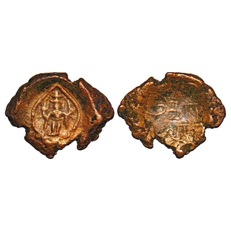 | Post Vijayanagar, Local Polygars, (17-18c AD), Copper Kasu, 2.87g, 16.22x20.80 mm, Obv: Standing deity Vishnu, front facing, an arched enclosure around, Rev: Tamil legend ‘Govi’, Very Fine, Very Scarce. |