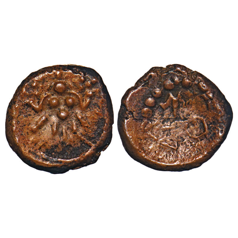 | Post Vijayanagar, Polygar issue, (17-18c AD), Copper Kasu, 2.33g, 12.53x12.65 mm, Obv: Standing Vishnu, Rev: Indistinct motif, Dotted border around. Very Fine, Very Scarce. |