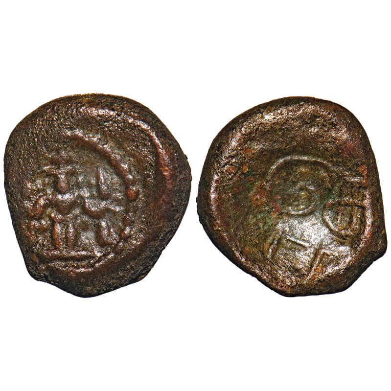 | Post Vijayanagar, Local Polygars, (17-18c AD), Copper Kasu, 3.21g, 15.10x13.83 mm, Obv: Two standing deities (Vishnu and Lakshmi ?), Dotted border around, Rev: Tamil legend ‘Govi’. Ref: Unlisted in major publications. Very Fine, Very Scarce. |