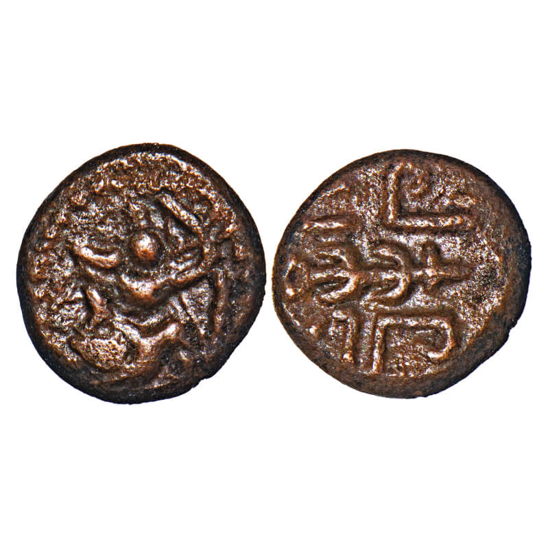 | Ginjee Marathas, (18 century AD), Copper fractional Kasu, 1.46g, 11.17x10.61 mm, Obv: Deity (Kartikeya ?) on peacock to left, holding bow and arrow, Rev: Tree like symbol at center, Crude Nagari legend ‘Rama’ repeated on top and bottom of tree. Ref: Unlisted in major publications. Very Fine, Rare. |