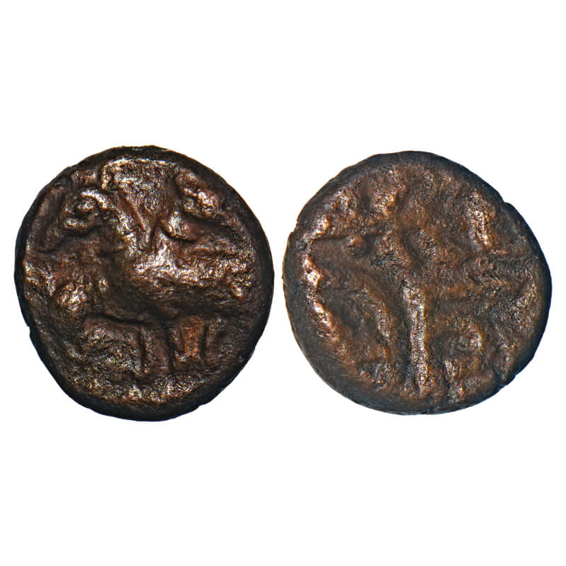 | Gingee Marathas, (18c AD), Copper Kasu, 2.00g, 11.32x10.63 mm, Obv: Horse rider to left, Rev: Tree like symbol at center, Crude Nagari legend ‘Rama’ above and below tree. Ref: Unlisted in major publications. About Very Fine, Very Scarce. |