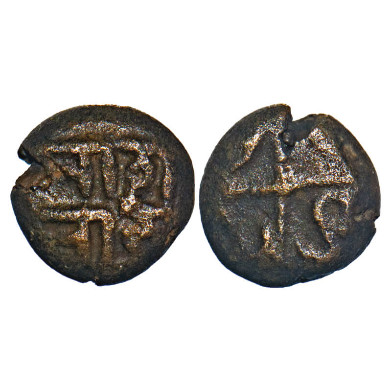 Tanjavur Marathas, (18c AD), Copper Kasu fraction, 1.39g, 8.38x8.40 mm, Obv: Crude Nagari legend reading in two lines as ‘Maha/Raja’, Rev: A cross with designs interspersed. Ref: Unlisted in major sources. Fine to Very Fine. Very Scarce.