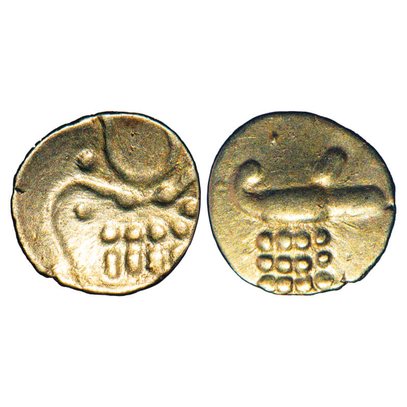 | Late Medieval South India, (16-18c AD), Gold fanam, Viraraya type, 0.31g, 8.23x8.40 mm, Obv: Stylised lion to right, Crescent above, Rev: Stylised boar to right. Very Fine, Very Scarce. |