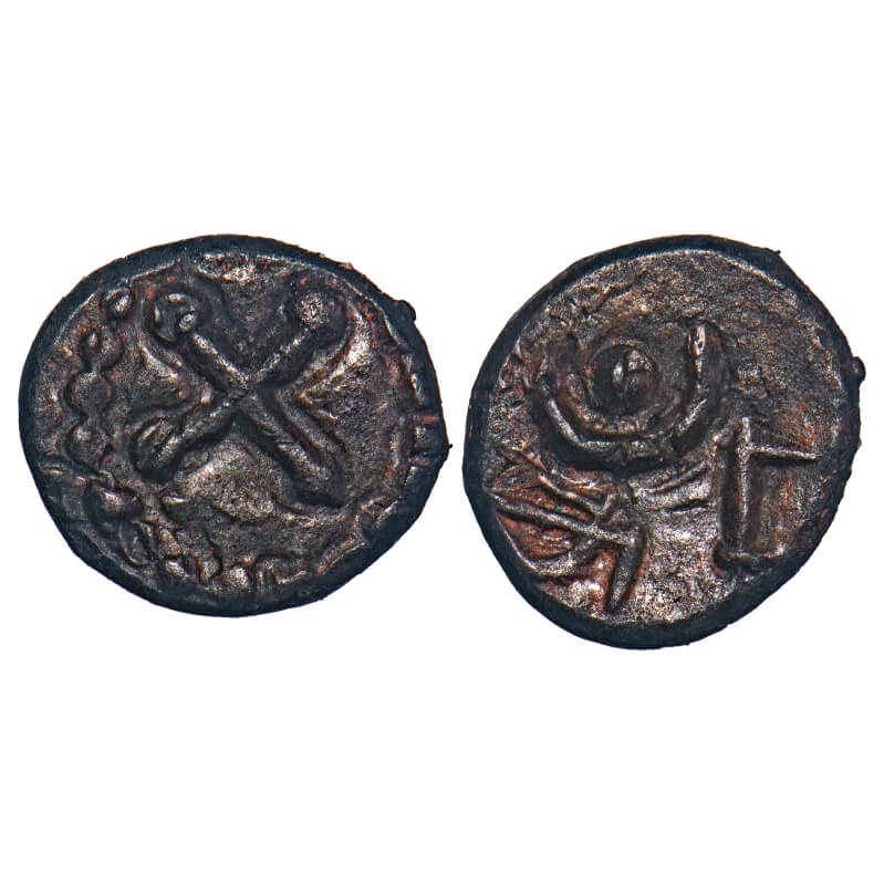 | Arcot Nawabs, Muhammad Ali, (1749-95 AD), Copper Kasu fraction, 1.57g, 11.14x12.56 mm, Obv: Cross symbol, Dotted border around, Rev: Sun and moon motifs, Tamil legend ‘Na Ba’ seen. Ref: Unlisted in major publications. Very Fine, Very Scarce. |