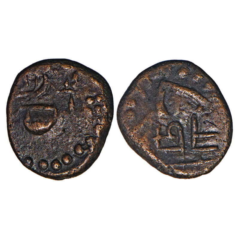 | Arcot Nawabs, Muhammad Ali, (1749-95 AD), Copper Kasu fraction, 1.42g, 11.32x10.16 mm, Obv: Indistinct motif, Rev: Tamil legend ‘Na B/a Bu’ partially seen, Overstruck. About Very Fine, Very Scarce. |