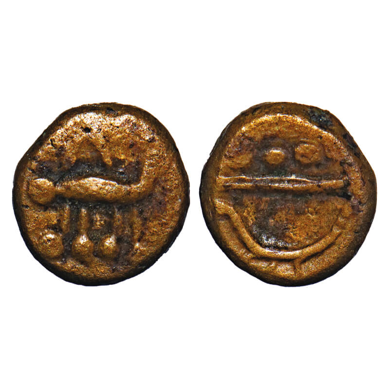 | Arcot Nawabs, Muhammad Ali, (1749-95 AD), Walajah type, Copper Kasu fraction, 1.17g, 9.58x9.12 mm, Obv: Crude Persian legend ‘Walajah’, Rev: Crude Persian legend ‘Shah Bombay’ partially seen. About Very Fine, Scarce. |