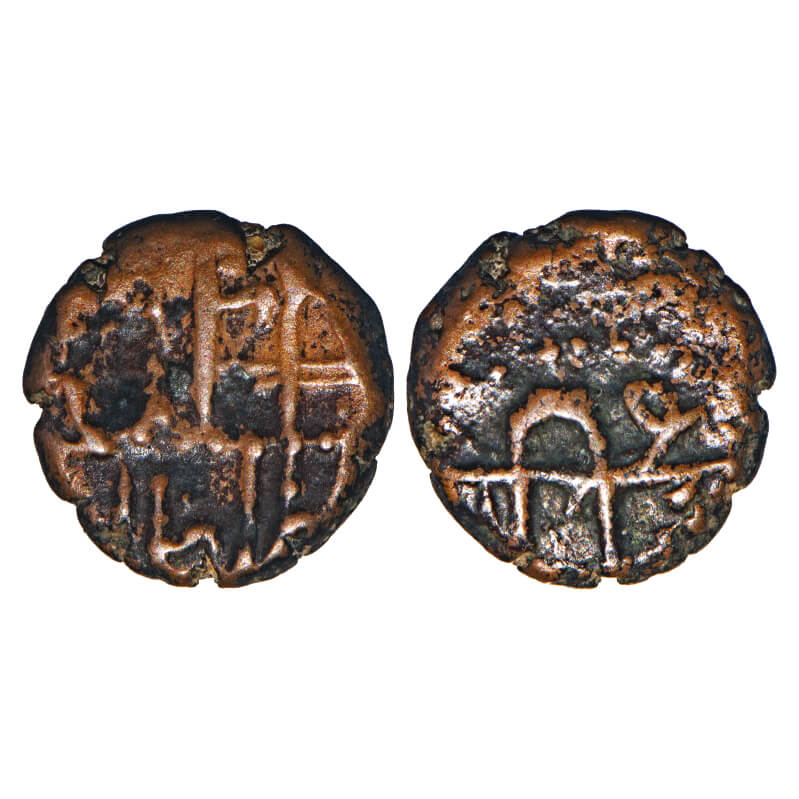 | Arcot Nawabs, Muhammad Ali, (1749-95 AD), Walajah type, Copper Kasu fraction, 1.95g, 11.73x11.38 mm, Obv: Crude Persian legend ‘Walajah’, Rev: Nagari letter ‘Shri’. Ref: Unlisted in major publications. About Very Fine, Very Scarce. |
