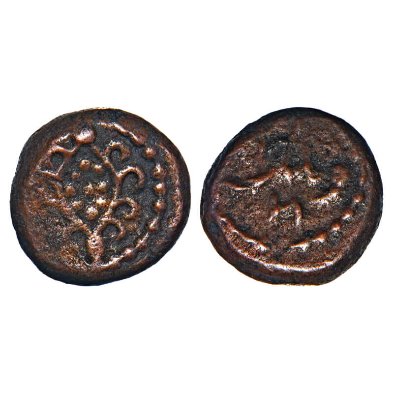 | Arcot Nawabs, Imitating Bijapur Sultans, (18c AD), Copper Kasu fraction, 1.64g, 9.56x9.72 mm, Obv: Fish with curled fins, Dotted border around, Rev: Crude Persian script ‘Sanah’, Dotted border around. About Very Fine, Very Scarce. |