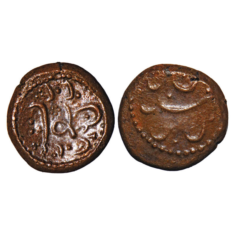 | Arcot Nawabs, (18c AD), Copper Kasu, 2.74g, 12.94x13.39 mm, Obv: Crude Persian legend, Dotted border around, Rev: Crude Persian legend, Dotted border around. Ref: Unlisted in major publications. Very Fine, Very Scarce. |