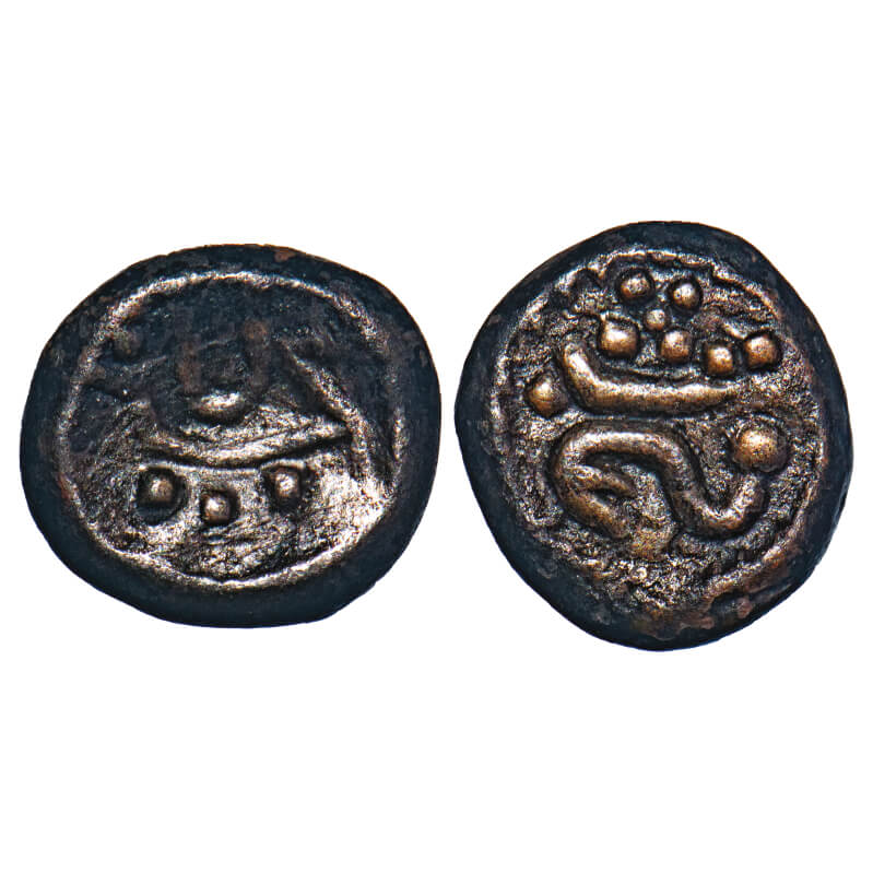 | Arcot Nawabs, (18c AD), Copper Kasu fraction, 1.76g, 12.28x10.44 mm, Obv: Crude Persian legend ‘Sanah’ partially seen, Rev: Crude Persian legend ‘shah bombay’ partially seen, Dotted border around. Very Fine, Very Scarce. |