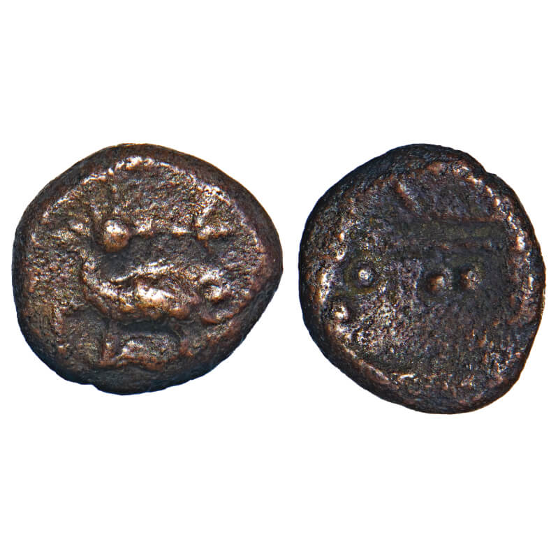 | Arcot Nawabs, (18c AD), Copper Kasu fraction, 1.20g, 9.15x9.85 mm, Obv: Deer walking to left, Trishul on top placed horizontal, Rev: Crude Persian legend ‘shah bombay’ partially seen. Ref: Unlisted in major publications. About Very Fine, Scarce. |
