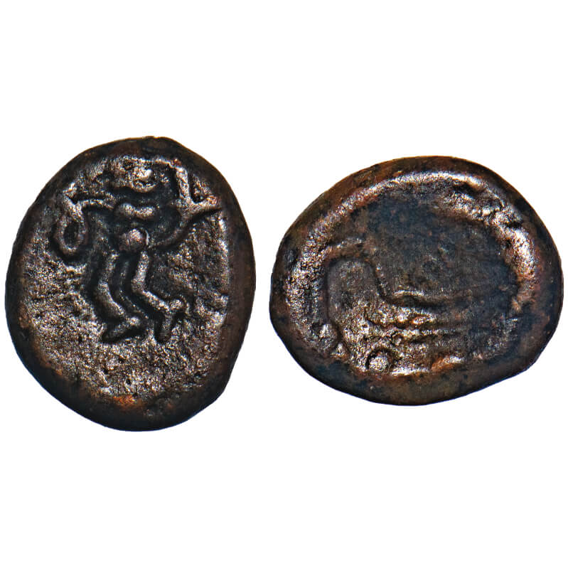 Arcot Nawabs, (18c AD), Copper Kasu fraction, 1.71g, 11.60x9.96 mm, Obv: Standing deity Hanuman to left, Rev: Crude Persian legend ‘shah bombay’ partially seen. Ref: Unlisted in major publications. About Very Fine, Very Scarce.