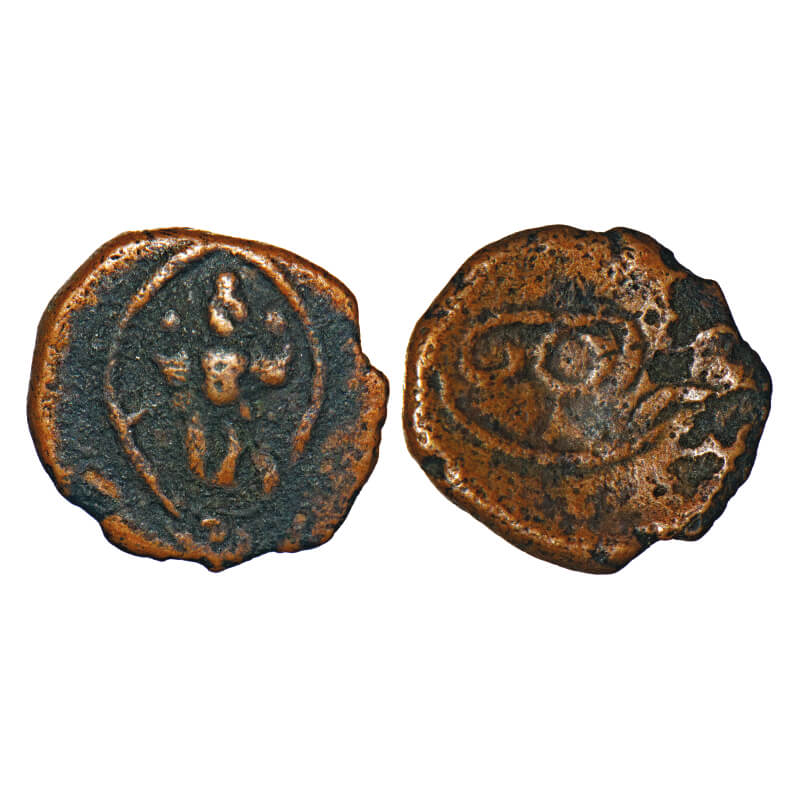 Arkat Nawabs, (17th century), Copper, 1.05g, 10.92x11.78mm, Obv: Vishnu standing within arch, Rev: 'Na' in Tamil. About Very Fine, Rare.