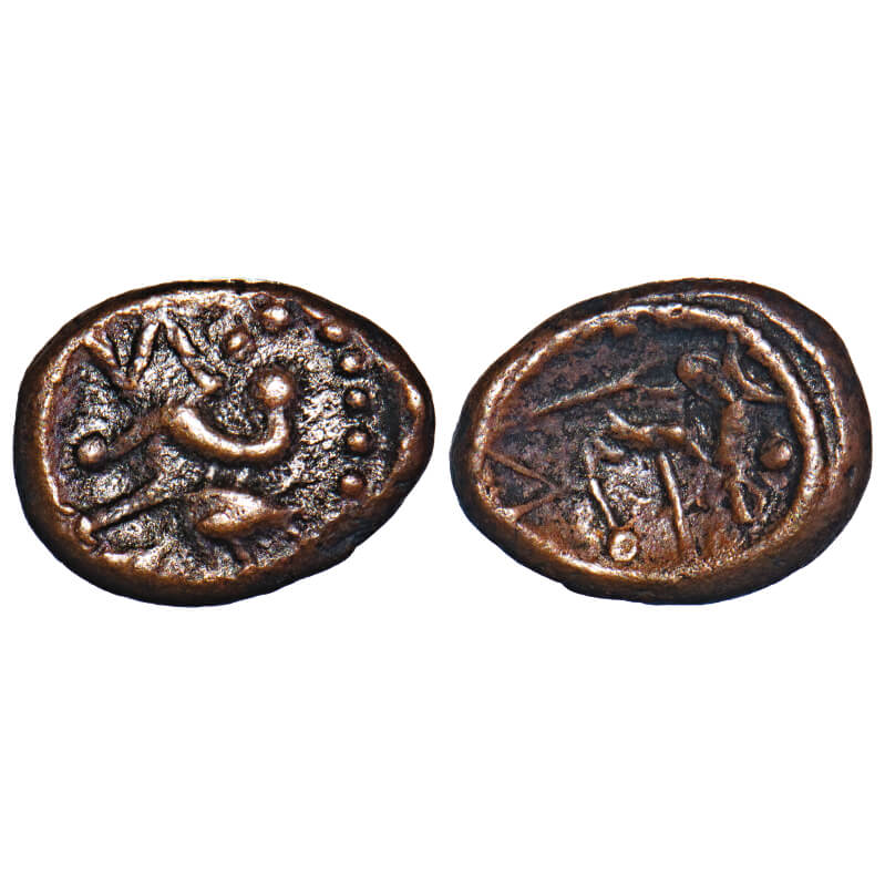 | Arcot Nawabs, (18c AD), Copper Kasu, 2.06g, 10.67x13.67 mm, Obv: Bird to right, Dotted border around, Rev: Crude Persian legend ‘shah bombay’ partially seen, Dotted border around, Over struck. Ref: Unlisted in major publications. About Very Fine, Very Scarce. |