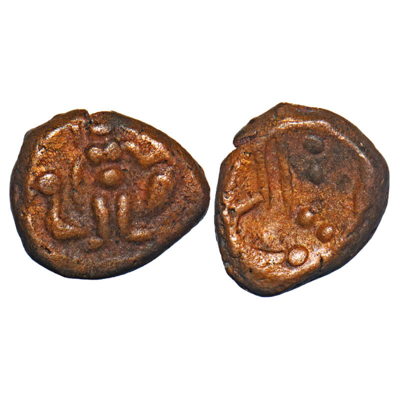 Arcot Nawabs, (18c AD), Copper Kasu fraction, 1.40g, 9.29x10.84 mm, Obv: Kartikeya seated on peacock to left, Rev: Crude Persian legend ‘shah bombay’ partially seen. Ref: Unlisted in major publications. Very Fine, Very Scarce.