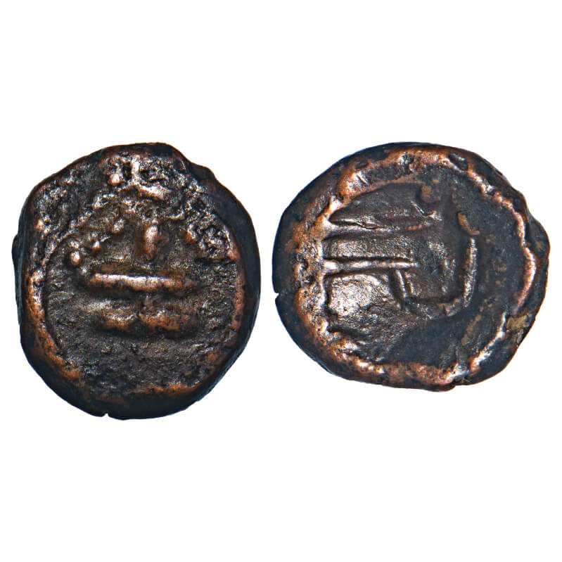 | Arcot Nawabs, (18c AD), Copper Kasu fraction, 1.75g, 11.50x10.20 mm, Obv: Shiva-Lingam, Circular border around, Rev: Crude Persian legend ‘shah bombay’ partially seen. Ref: Unlisted in major publications. About Very Fine, Scarce. |