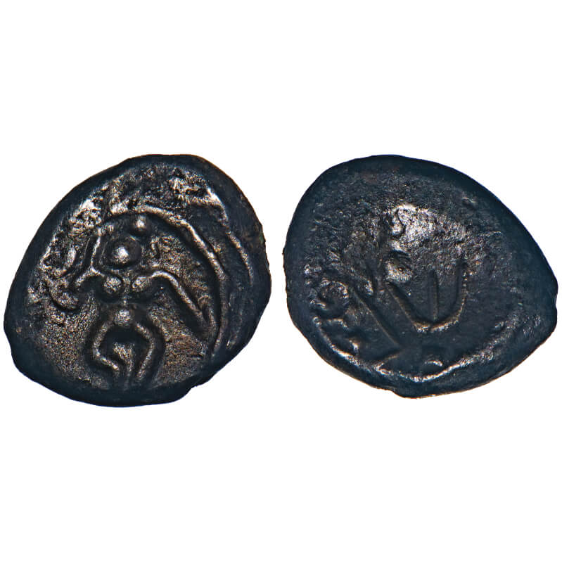 | Arcot Nawabs, (18c AD), Copper Kasu fraction, 1.88g, 10.97x11.92 mm, Obv: Dancing Krishna, Circular border around, Rev: Crude Persian legend ‘shah bombay’ partially seen. Ref: Unlisted in major publications. Very Fine, Very Scarce. |