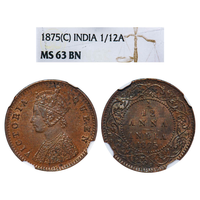 Victoria Queen, Copper, 1/12 Anna, 1875, Calcutta Mint, Obv A, No mint mark. F. Prid 784. GK 886. NGC Slabbed MS 63 BN. Extremely Rare. (Only 1 coin graded higher by NGC and none by PCGS in this catagory till 1/3/2025. A coin of this same grade sold for Rs 81000/- in Bombay Auctions # 52 on 21st April 2024)