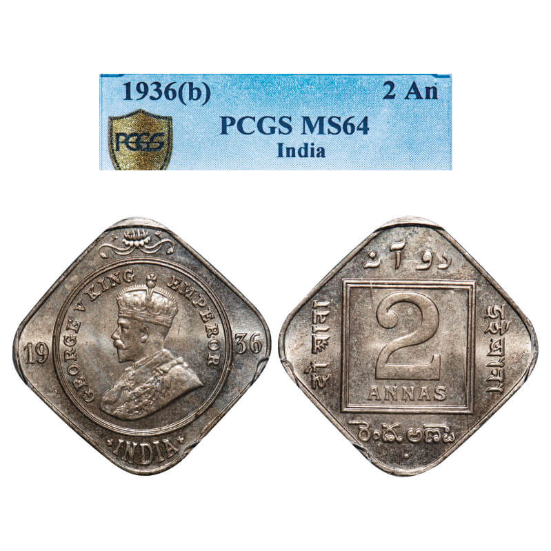 George V, Copper-Nickel, 2 Annas, 1936, Bombay Mint, Dot. F. Prid 903. GK 1140. PCGS Slabbed MS 64. Very Rare. (Only 8 coins graded higher by NGC and 2 by PCGS in this category till 1/3/2025)