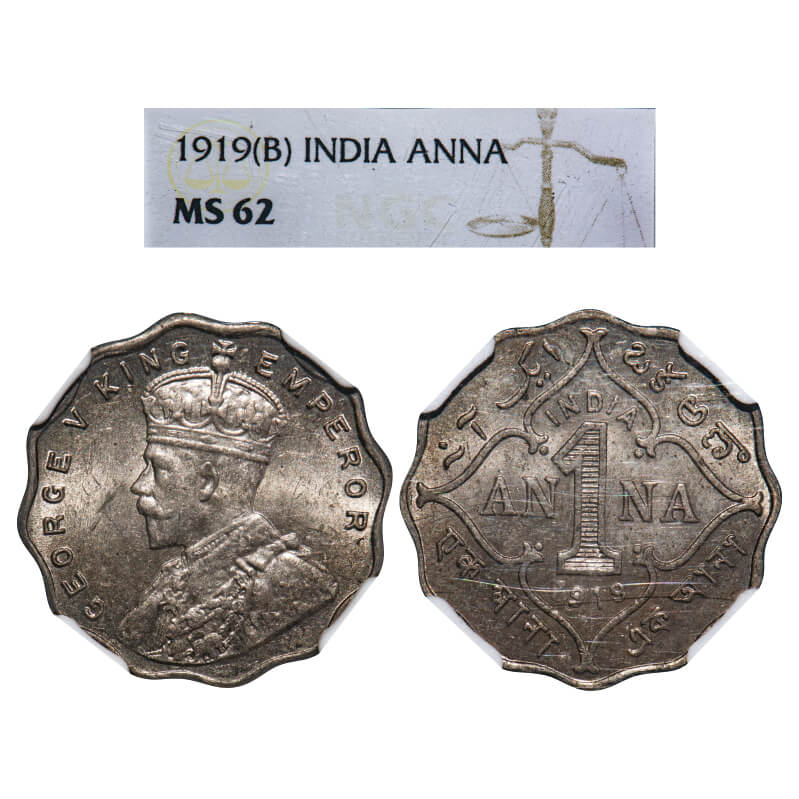 George V, Copper-Nickel, 1 Anna, 1919, Bombay Mint, No dot. F. Prid 949. GK 1149. NGC Slabbed MS 62. Rare.