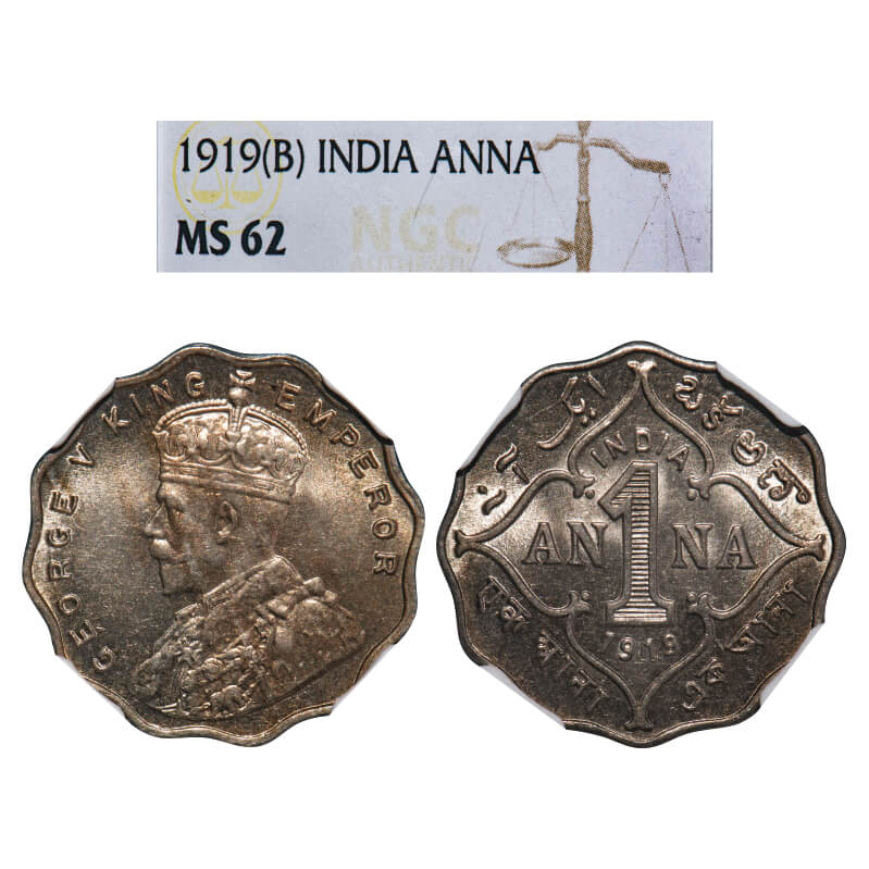 George V, Copper-Nickel, 1 Anna, 1919, Bombay Mint, No dot. F. Prid 949. GK 1149. NGC Slabbed MS 62. Rare.