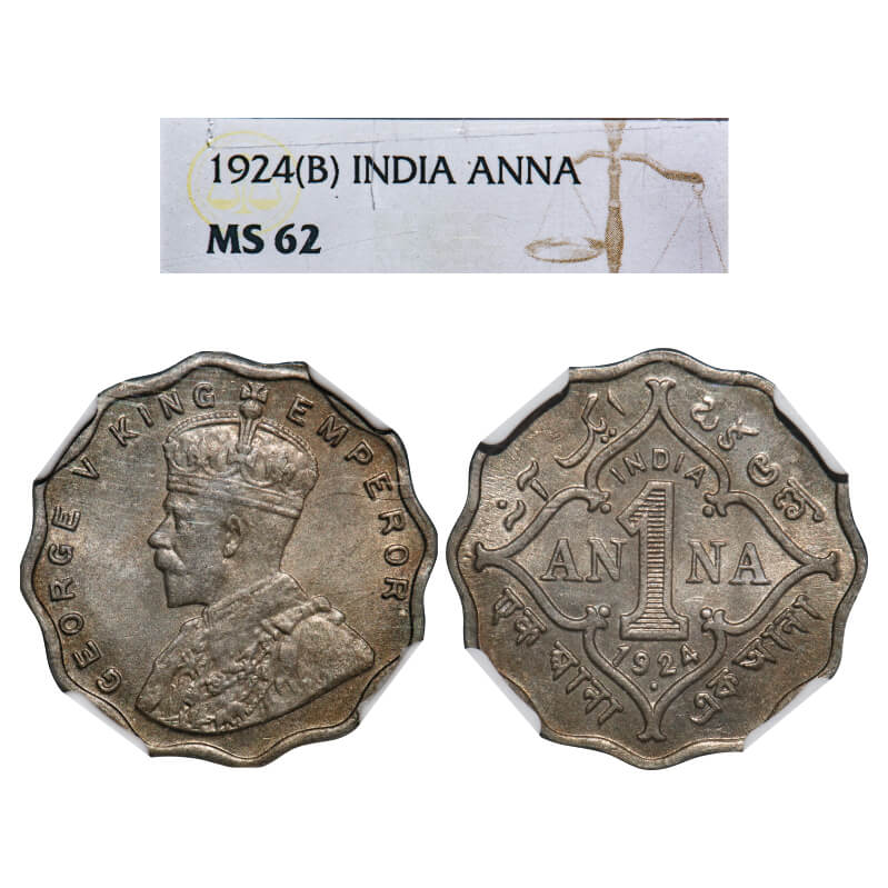 George V, Copper-Nickel, 1 Anna, 1924, Bombay Mint, Dot. F. Prid 952. GK 1152. NGC Slabbed MS 62. Extremely Rare. (17 coins graded higher by NGC and 5 by PCGS in this category till 1/3/2025)