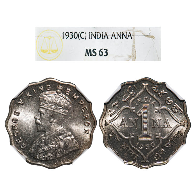 George V, Copper-Nickel, 1 Anna, 1930, Calcutta Mint, No dot. F. Prid 936. GK 1163. NGC Slabbed MS 63. Extremely Rare. (18 coins graded higher by NGC and 10 by PCGS in this category till 1/3/2025)