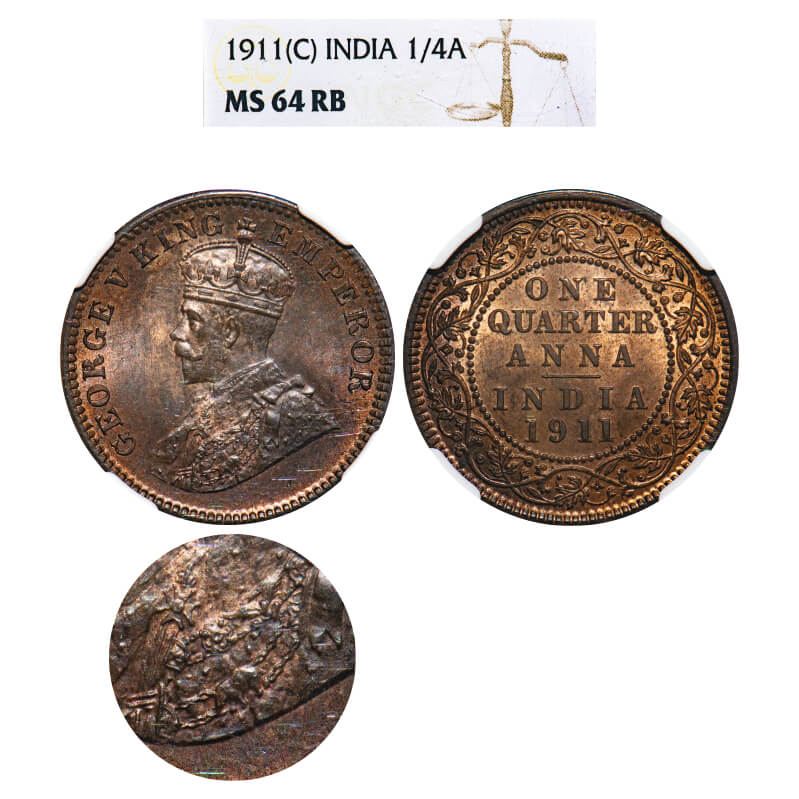 | George V, Bronze, Quarter Anna, 1911, Calcutta Mint, No dot, Pig-type. F. Prid 656. GK 1171. NGC Slabbed MS 64 RB. Extremely Rare. (Only 6 coins graded higher by NGC and 3 by PCGSin this category till 1/3/2025). The bulk of the coins minted in 1911 was withdrawn from circulation, and the unused stocks were destroyed, because the elephant on the Emperor's robe was thought to resemble a pig which caused many Hindus and Muslims to boycott the coinage because they consider the animal unclean. Consequently, 1911 coins are rare and highly prized, particularly in the smaller denominations and fractions. This high grade original 1911 Quarter Anna clearly illustrates the cause of the controversy surrounding the coinage, for indeed the elephant does resemble a pig. The animal was redrawn in the coinage for subsequent years leaving no doubt that it had a trunk and not a snout. An exceptional coin with a rich numismatic and political history. |