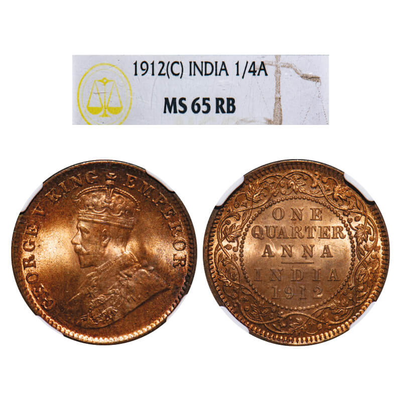 George V, Bronze, Quarter Anna, 1912, Calcutta Mint, No dot, Elephant-type. F. Prid 658. GK 1172. NGC Slabbed MS 65 RB. Extremely Rare. (Only 6 coins graded higher by NGC and none by PCGS in this category till 1/3/2025)