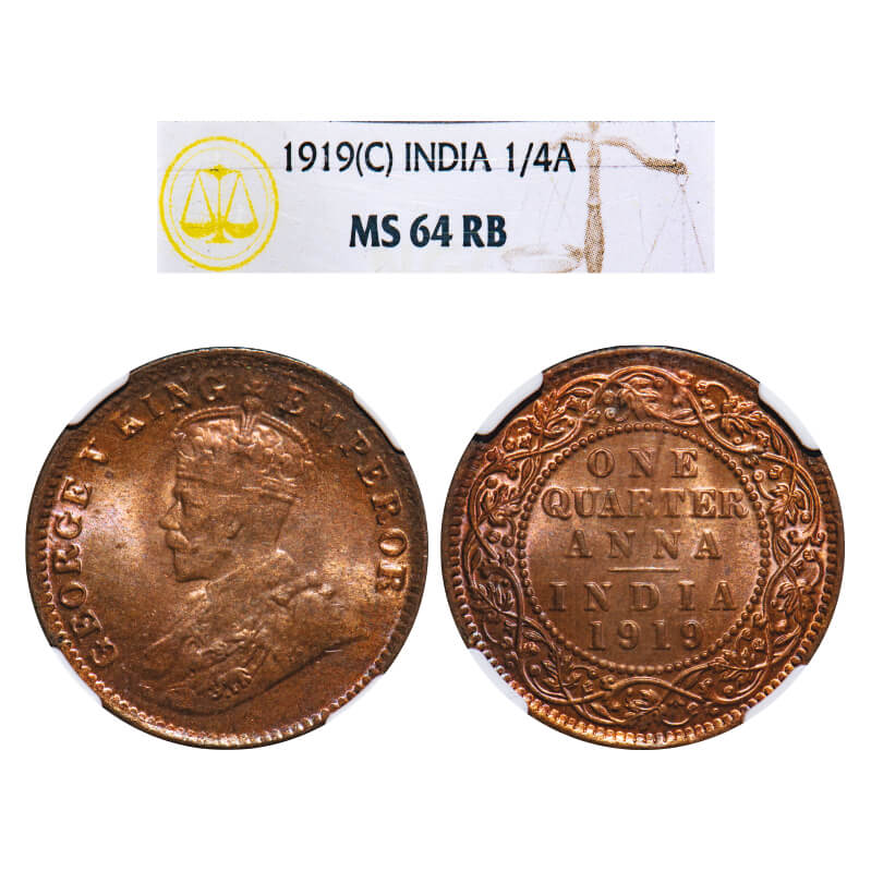 George V, Bronze, Quarter Anna, 1919, Calcutta Mint, No dot, Elephant-type. F. Prid 664. GK 1178. NGC Slabbed MS 64 RB. Very Rare.