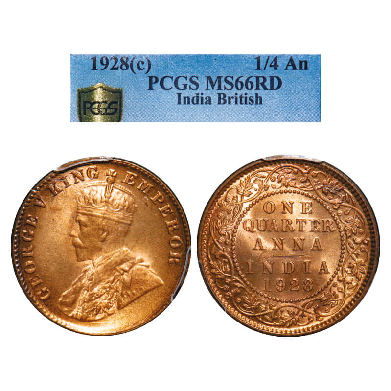 George V, Bronze, Quarter Anna, 1928, Calcutta Mint, No dot, Elephant-type. F. Prid 669. GK 1188. PCGS Slabbed MS 66 RD. Extremely Rare. (12 coins graded higher by NGC and 1 by PCGS in this category till 1/3/2025)