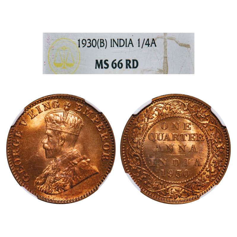 George V, Bronze, Quarter Anna, 1930, Bombay Mint, Dot, Elephant-type. F. Prid 671. GK 1190. NGC Slabbed MS 66 RD. Extremely Rare.