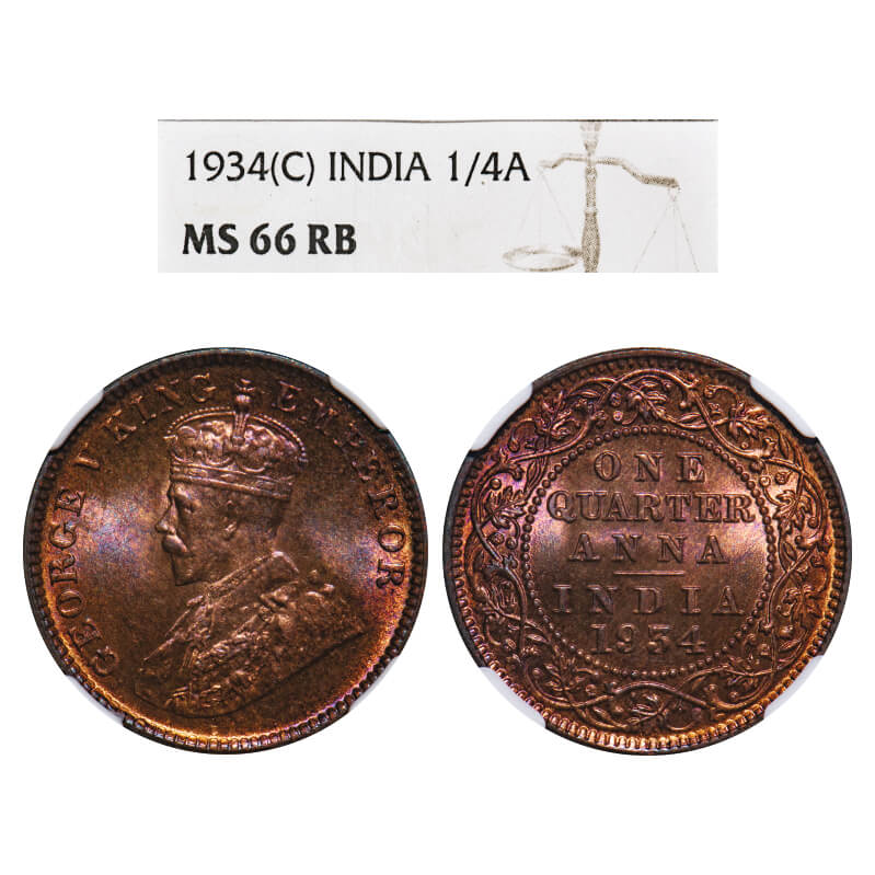 George V, Bronze, Quarter Anna, 1934, Calcutta Mint, No dot, Elephant-type. F. Prid 674. GK 1194. NGC Slabbed MS 66 RB. Extremely Rare. (Only 1 coin graded higher by NGC and none by PCGS in this category till 1/3/2025)