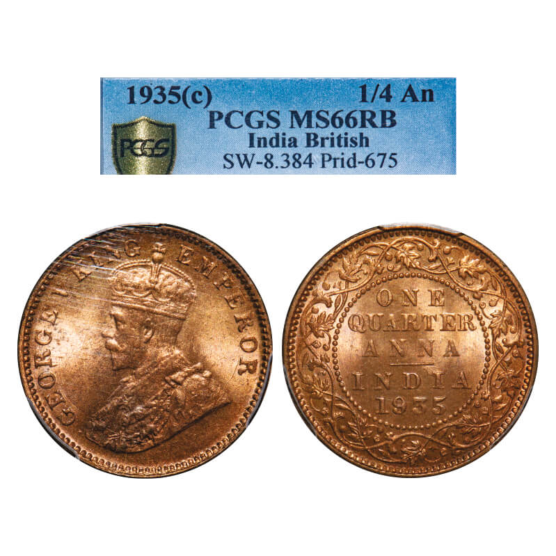 George V, Bronze, Quarter Anna, 1935, Calcutta Mint, No dot, Elephant-type. F. Prid 675. GK 1195. PCGS Slabbed MS 66 RB. Very Rare. (Only 10 coins graded higher by NGC and none by PCGS in this category till 1/3/2025)