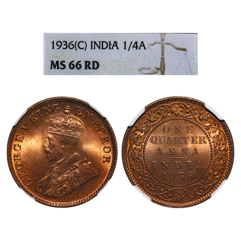 George V, Bronze, Quarter Anna, 1936, Calcutta Mint, No dot, Elephant-type. F. Prid 676. GK 1197. NGC Slabbed MS 66 RD. Extremely Rare.