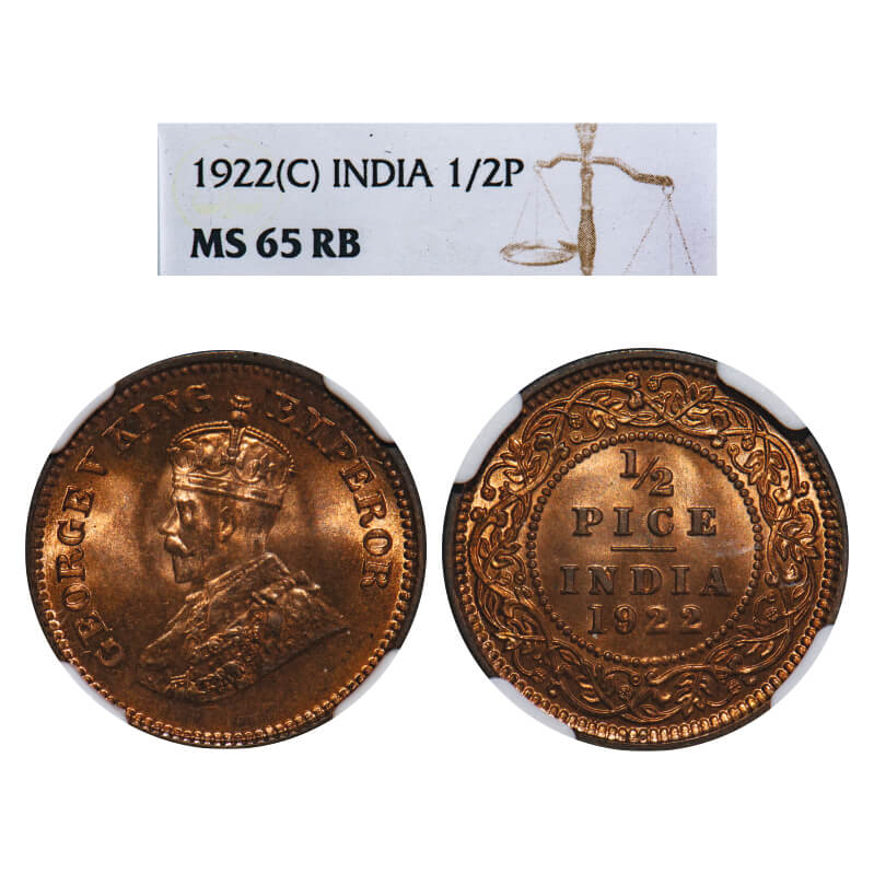 George V, Bronze, 1/2 Pice, 1922, Calcutta Mint, No mint mark. F. Prid 755. GK 1208. NGC Slabbed MS 65 RB. Extremely Rare. (12 coins graded higher by NGC and 2 by PCGS in this category till 1/3/2025)