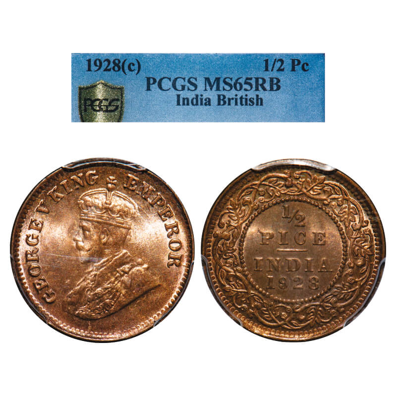 George V, Bronze, 1/2 Pice, 1928, Calcutta Mint, No mint mark. F. Prid 761. GK 1214. PCGS Slabbed MS 65 RB. Exceedingly Rare. (Only 2 coins graded higher by NGC and none by PCGS in this category till 1/3/2025)