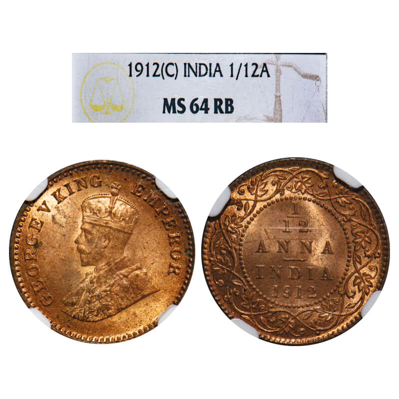 George V, Bronze, 1/12 Anna, 1912, Calcutta Mint, No dot. F. Prid 827. GK 1223. NGC Slabbed MS 64 RB. Very Rare. (16 coins graded higher by NGC and none by PCGS in this category till 1/3/2025)
