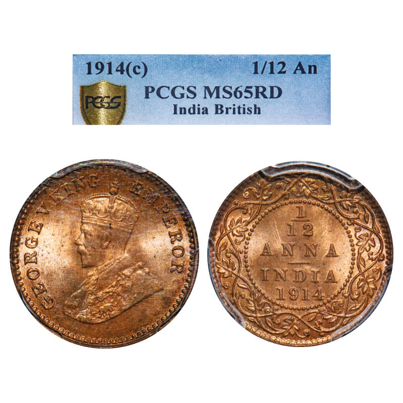 George V, Bronze, 1/12 Anna, 1914, Calcutta Mint, No dot. F. Prid 829. GK 1225. PCGS Slabbed MS 65 RD. Very Rare. (14 coins graded higher by NGC and 8 by PCGS in this category till 1/3/2025)