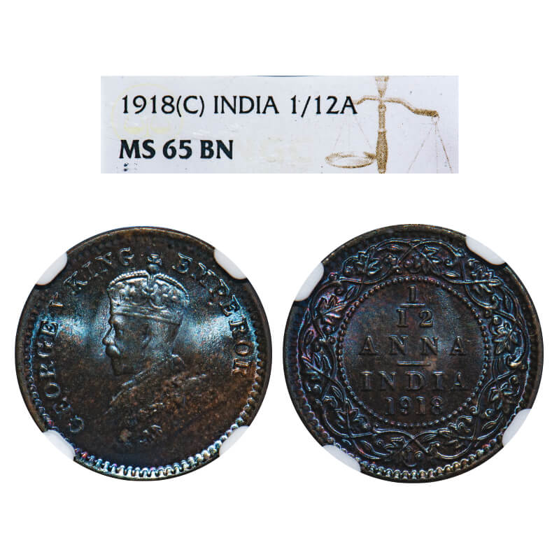 George V, Bronze, 1/12 Anna, 1918, Calcutta Mint, No dot. F. Prid 833. GK 1229. NGC Slabbed MS 65 BN. Very Rare. (Only 1 coin graded higher by NGC and none by PCGS in this category till 1/3/2025)