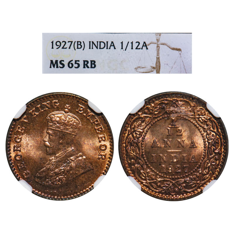 George V, Bronze, 1/12 Anna, 1927, Bombay Mint, Dot. F. Prid 855. GK 1241. NGC Slabbed MS 65 RB. Very Rare. (12 coins graded higher by NGC and none by PCGS in this category till 1/3/2025)