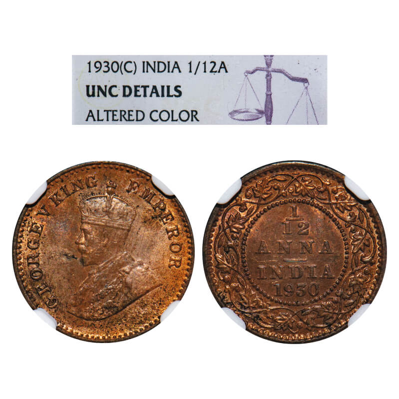 George V, Bronze, 1/12 Anna, 1930, Calcutta Mint, No dot. F. Prid 844. GK 1246. NGC Slabbed UNC Details, Altered Colour. Scarce.