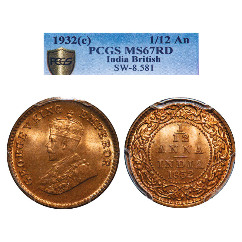 George V, Bronze, 1/12 Anna, 1932, Calcutta Mint, No dot. F. Prid 846. GK 1248. PCGS Slabbed MS 67 RD. Exceedingly Rare. (Only 1 coin graded higher by NGC and and 1 by PCGS in this category till 1/3/2025)