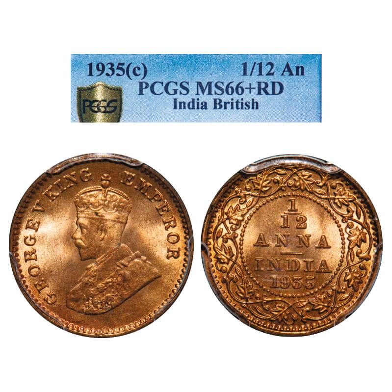 George V, Bronze, 1/12 Anna, 1935, Calcutta Mint, No dot. F. Prid 849. GK 1251. PCGS Slabbed MS 66+ RD. Exceedingly Rare. (Only 2 coins graded higher by NGC and 2 by PCGS in this category till 1/3/2025)