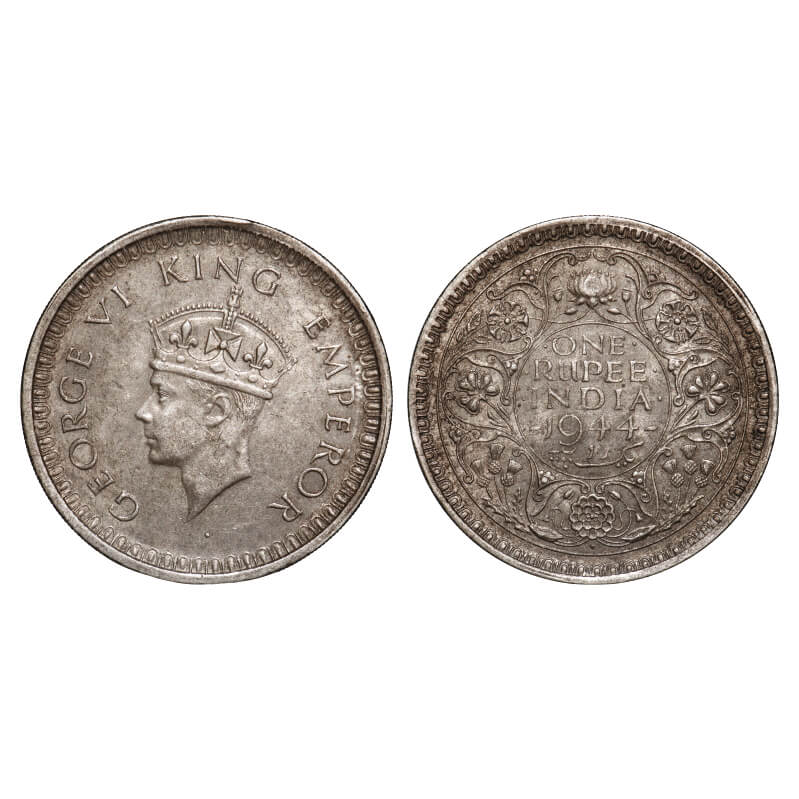 | George VI, Half Silver, Rupee, 1944, Bombay Mint, B(a)/III, Diamond, Security edge. F. Prid 244. GK 1273. Very Fine+. Extremely Rare. Mule Obverse dies of 1943 paired with reverse dies of 1944, Obverse has a broad rim, star lotus on reverse. |