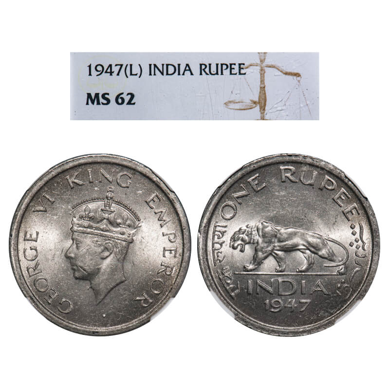 George VI, Nickel, Rupee, 1947, Lahore Mint, E/IV, No mint mark, Security edge. F. Prid 864. GK 1293. NGC Slabbed MS 62. Rare.