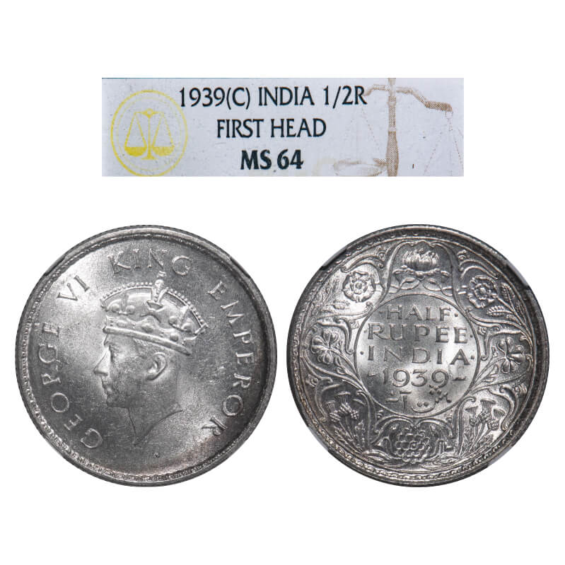 | George VI, Silver, Half Rupee, 1939, Calcutta Mint, A/I, No dot, Head Type I, Milled edge. F. Prid 363. GK 1297. NGC Slabbed MS 64. Very Rare. (Only 6 coins graded higher by NGC and 1 by PCGS in this category till 1/3/2025) |