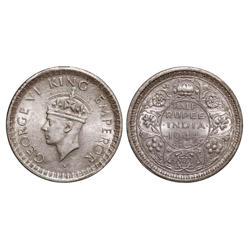 | George VI, Half Silver, Half Rupee, 1944, Lahore Mint, B/II, 'L' raised, Head Type II, Security edge, Rev lettering w/o serif. F. Prid Unlisted. GK 1314. About Uncirculated. Scarce. |